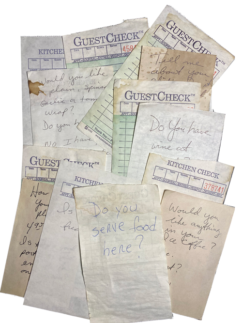 For most of his life, Rich Oettinger’s mother made a living either as a waitress or restaurant owner (server or restaurateur in modern lingo). Like any career serving the public, it involved an ever-changing cast of interesting—and sometimes irritating—characters, and their quips, comments and questions, painstakingly recorded on the pages of order pads over the course of decades, are compiled here in a hilarious book that will resonate with anyone who’s spent any amount of time working in the restaurant or hospitality industries.